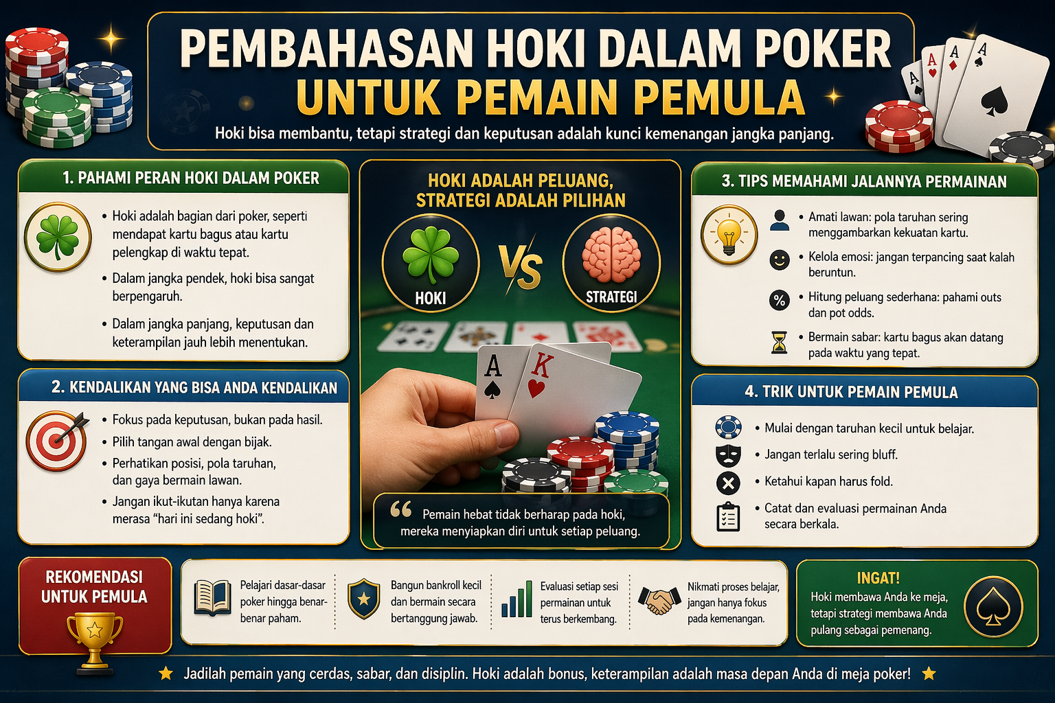 Pembahasan hoki dalam poker untuk pemain pemula sering menjadi topik yang paling membuat penasaran. Banyak orang baru mengira bahwa kemenangan hanya ditentukan oleh kartu bagus, padahal kenyataannya tidak sesederhana itu. Ada unsur keberuntungan, ada pembacaan situasi, ada kesabaran, dan ada keputusan-keputusan kecil yang justru menentukan hasil akhir. Karena itu, memahami peran hoki dengan cara yang tepat akan membantu pemain pemula melihat permainan secara lebih jernih, tidak mudah terbawa emosi, dan lebih siap menghadapi dinamika di meja. Artikel ini membahas secara runtut bagaimana hoki bekerja dalam poker, apa batasnya, dan mengapa pemain tetap perlu belajar dasar permainan meskipun kartu bagus kadang datang tanpa diduga.